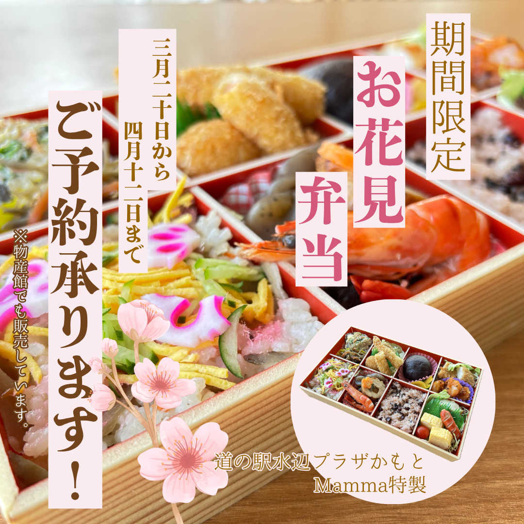 こんにちは。スタッフKです('ω')ノ 3月も下旬に入り、お花見の時期が近づいてまいりました! 今年の熊本の開花予想日は3/21と予想されています🌸 当道の駅水辺プラザかもともお花見スポットの一つでもあり、当館を挟むように桜並木があり、 桜が満開になると、見ごたえのある景色が広がります!🌸 ぜひこの機会に桜を愛でながら、当館特製お花見弁当を楽しんでみてはいかがでしょうか🥰 この時期だけの特別な豪華お弁当ですよ🍱 ・特製お花見弁当 1個 1,200円(税込み) ご注文も店頭での受付、TEL、FAXでも承りますので、お渡し日の3日前までにご予約ください。 また、山鹿市内限定にはなりますが、20個以上のお弁当注文で配達も承りますよ~٩( ''ω'' )و 【問い合わせ先】 道の駅水辺プラザかもと TEL:0968-46-1126(☎受付 9:00~18:30) FAX:0968-46-1127 この機会に桜舞い散る水辺プラザかもとにぜひお越しください! 皆様のお越しをスタッフ一同、心よりお待ちしております!