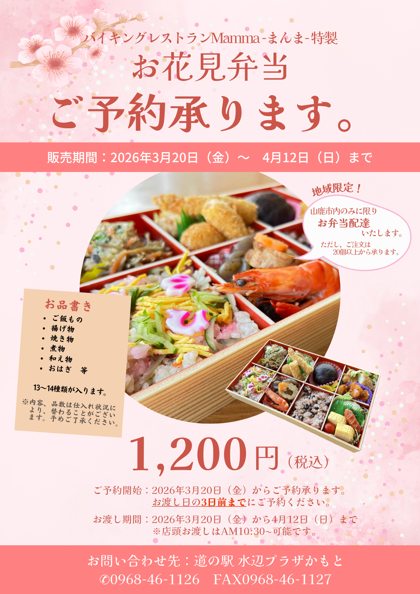 こんにちは。スタッフKです('ω')ノ 3月も下旬に入り、お花見の時期が近づいてまいりました! 今年の熊本の開花予想日は3/21と予想されています🌸 当道の駅水辺プラザかもともお花見スポットの一つでもあり、当館を挟むように桜並木があり、 桜が満開になると、見ごたえのある景色が広がります!🌸 ぜひこの機会に桜を愛でながら、当館特製お花見弁当を楽しんでみてはいかがでしょうか🥰 この時期だけの特別な豪華お弁当ですよ🍱 ・特製お花見弁当 1個 1,200円(税込み) ご注文も店頭での受付、TEL、FAXでも承りますので、お渡し日の3日前までにご予約ください。 また、山鹿市内限定にはなりますが、20個以上のお弁当注文で配達も承りますよ~٩( ''ω'' )و 【問い合わせ先】 道の駅水辺プラザかもと TEL:0968-46-1126(☎受付 9:00~18:30) FAX:0968-46-1127 この機会に桜舞い散る水辺プラザかもとにぜひお越しください! 皆様のお越しをスタッフ一同、心よりお待ちしております!