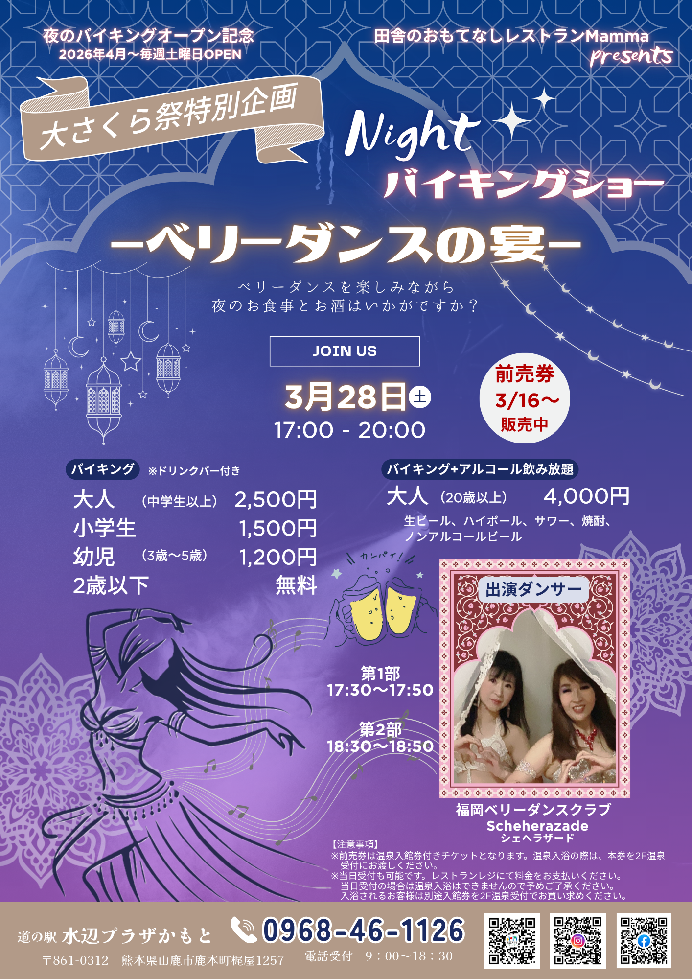 田舎のおもてなしレストランMamma-まんま‐からのお知らせです。 3月28日(土)に Nightバイキングショー「ベリーダンスの宴」を開催します♬ 昨年夏に初めて夜のバイキング開催しましたが、お客様から好評をいただきました(^^♪ 暖かくなり、桜が咲くこの時期に今回は「ベリーダンス💃」を楽しみながら 夜のお食事とお酒はいかがですか? 福岡ベリーダンスクラブ Scheherazade(シェヘラザード)の皆さんが 素敵なダンス💃を披露してくださいます! この機会にお食事とお酒とダンスと共にゆっくりと過ごしてみてはいかがでしょうか。 料金は以下の通りです。 ★バイキング ※ドリンクバー付き 大人(中学生以上) 2,500円 小学生 1,500円 幼児(3歳~5歳) 1,200円 2歳以下 無料 ★バイキング+アルコール飲み放題 大人(20歳以上) 4,000円 ※生ビール、ハイボール、サワー、焼酎等が飲み放題 前売券を販売していますので、ぜひご購入くださいませ。 前売券は温泉入館券付きとなっていますので、食事とダンスを楽しんだ後はお風呂にGO!もできますよ~ 当日受付も可能です。 ※当日受付は温泉入館券は付いておりませんので、予めご了承ください。 他詳細やお尋ねはお問合せください。 道の駅水辺プラザかもと TEL 0968-46-1126(受付時間9:00~18:30)