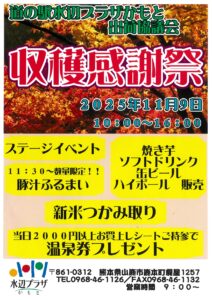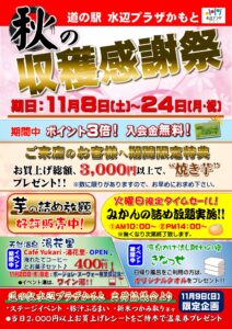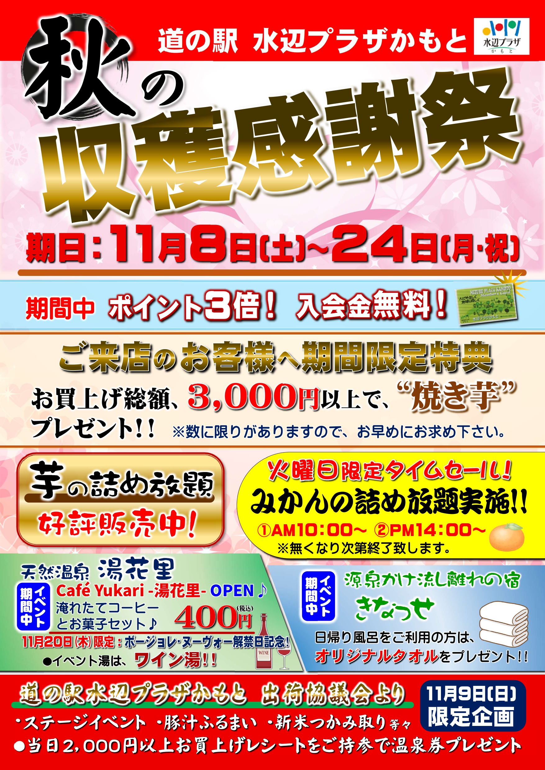 秋のイベントのお知らせです(^_-)-☆ 11/8日(土)~24日(月・祝) 「秋の収穫感謝祭」を開催します!🍁🍂 物産館 ・お芋の詰め放題🍠 ・火曜日限定タイムセール「みかんの詰め放題」1袋 450円 AM10:00~、PM2:00~ ・お買上げ3,000円以上で「焼き芋🍠」のプレゼントもありますよ~ ・期間中、メンバーズカードの入会金無料、ポイント3倍 2F 温泉 湯花里 ・Café Yukari -湯花里-☕ OPEN♪ ※温泉水で特製コーヒーを入れます! ・11/20(木)限定 ボージョ・ヌーヴォー解禁日記念 イベント風呂:「ワイン風呂🍷♨️」 源泉かけ流し離れの宿-きなっせ― ・日帰り風呂をご利用のお客様へ 水辺オリジナルタオルをプレゼント🎁 さらに! 11/9(日)10:00~16:00 道の駅水辺プラザかもと出荷協議会 特別企画 ・ステージイベント ・豚汁ふるまい ・新米のつかみ取り ・焼き芋販売やソフトドリンク、アルコール等の販売 また、当日2000円以上お買い上げレシートを持参で温泉券プレゼント🎁 この期間はいろいろなイベントやサービスが目白押し! ぜひお越しいただき、楽しんでくださいね~(*´ω`*)![]()