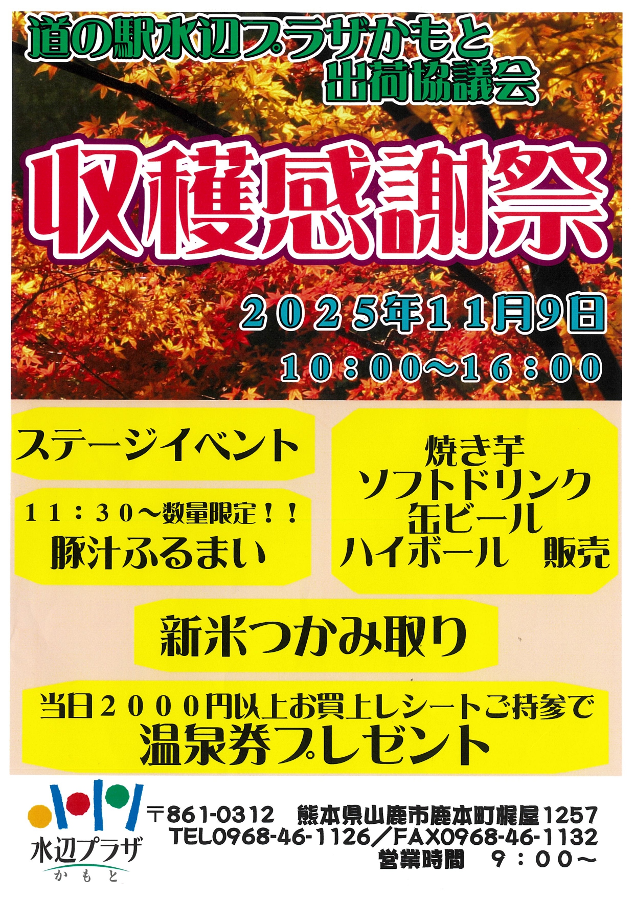 秋のイベントのお知らせです(^_-)-☆ 11/8日(土)~24日(月・祝) 「秋の収穫感謝祭」を開催します!🍁🍂 物産館 ・お芋の詰め放題🍠 ・火曜日限定タイムセール「みかんの詰め放題」1袋 450円 AM10:00~、PM2:00~ ・お買上げ3,000円以上で「焼き芋🍠」のプレゼントもありますよ~ ・期間中、メンバーズカードの入会金無料、ポイント3倍 2F 温泉 湯花里 ・Café Yukari -湯花里-☕ OPEN♪ ※温泉水で特製コーヒーを入れます! ・11/20(木)限定 ボージョ・ヌーヴォー解禁日記念 イベント風呂:「ワイン風呂🍷♨️」 源泉かけ流し離れの宿-きなっせ― ・日帰り風呂をご利用のお客様へ 水辺オリジナルタオルをプレゼント🎁 さらに! 11/9(日)10:00~16:00 道の駅水辺プラザかもと出荷協議会 特別企画 ・ステージイベント ・豚汁ふるまい ・新米のつかみ取り ・焼き芋販売やソフトドリンク、アルコール等の販売 また、当日2000円以上お買い上げレシートを持参で温泉券プレゼント🎁 この期間はいろいろなイベントやサービスが目白押し! ぜひお越しいただき、楽しんでくださいね~(*´ω`*)![]()