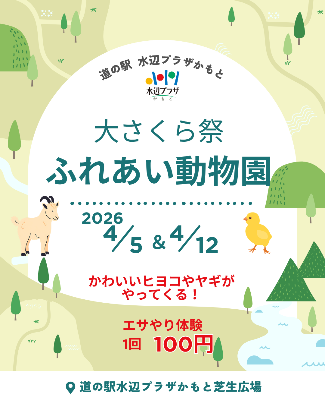 大さくら祭も4/12で終了しますが、明日(4/5(日))は『ふれあい動物園』がやってきます🐤 かわいいヒヨコやヤギ(子ヤギもいるようです🐐)にエサやり体験もできますよ~ 1回 100円 桜も満開で少しずつ散り始めています🌸 風が吹くと桜吹雪でとてもキレイですよ~🌸 この機会に気持ちいい芝生広場で動物たちと触れ合ってみてはいかがでしょうか~🐤🐐 皆様のお越しをお待ちしております。