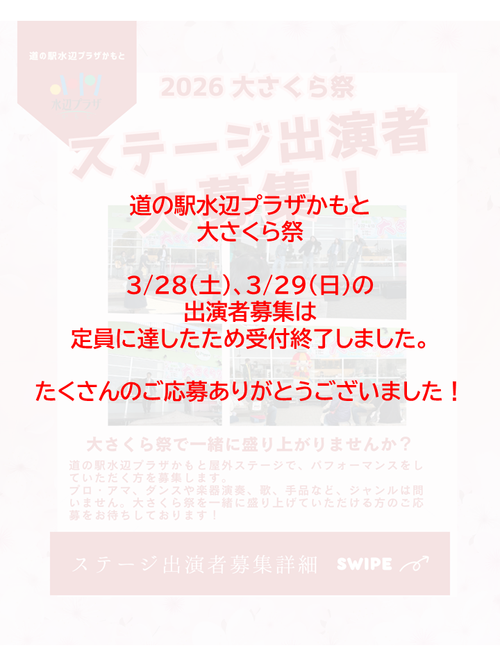 大さくら祭でのステージ出演者募集につきまして、定員に達したため、 両日の受付を終了いたしました。 たくさんのご応募ありがとうございました。 出演者の皆さんのパフォーマンス楽しみですね~(*‘∀‘) 大さくら祭の詳細は後日お知らせしますので、皆様お楽しみにお待ちください!