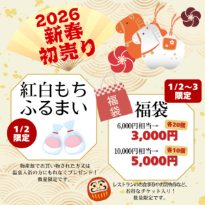 また、1/2は紅白もち振る舞い、1/2~3の2日間は新春福袋販売を行いますので、